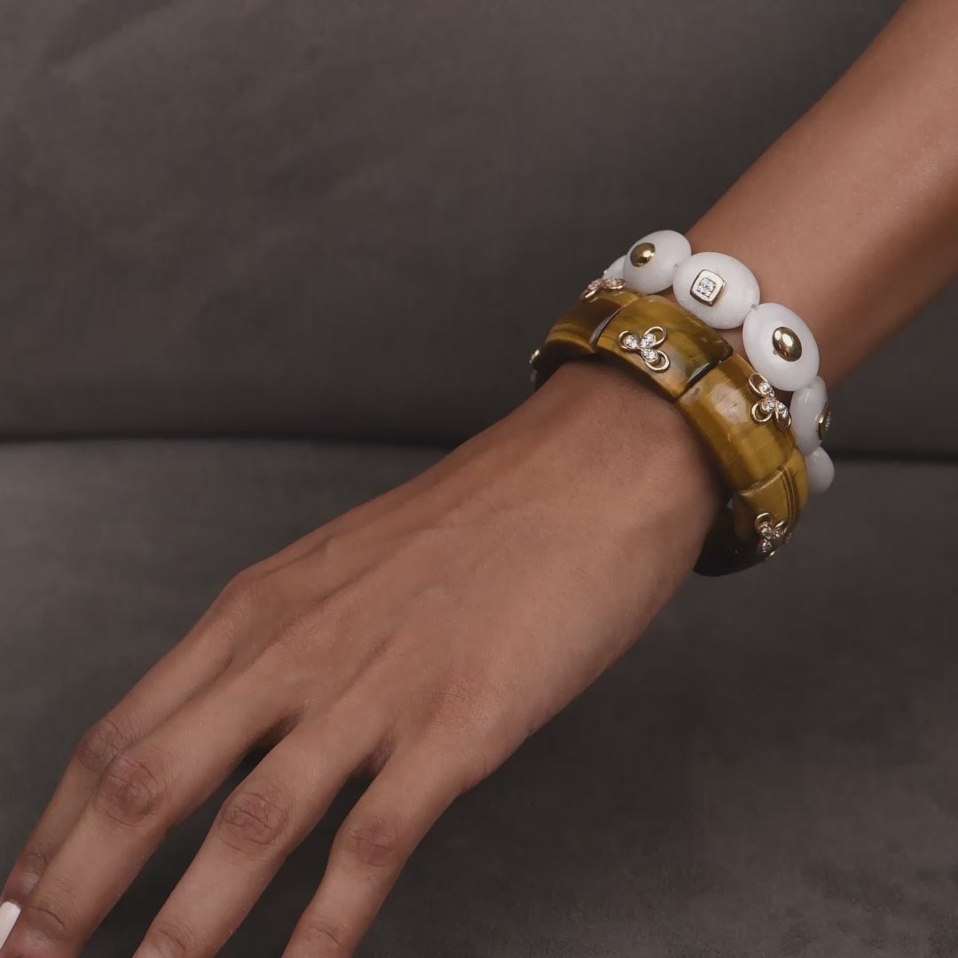Snap on style! Easy to wear bracelet on tiger eye pieces with gold and diamond 3 petal flowers.