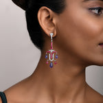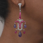 Statement contemporary earrings featuring Diamonds, Blue Tanzanite and pink spinel drops, with a hint of pink enamel to elevate your look to the next level.
